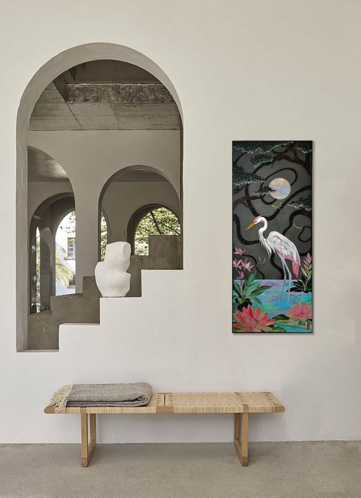 Les couleurs intenses, les jeux de lumières, de matières et les motifs graphiques caractéristiques de la marqueterie de verre génèrent un impact visuel fort. Intégrer une œuvre d’art en marqueterie de verre à
