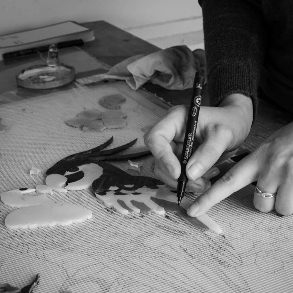 Sarah Revret propose une réinterprétation contemporaine de la mosaïque, fondée sur le détournement du verre de vitrail. Traditionnellement destiné à être traversé par la lumière, le verre est ici fixé sur des supports opaques, permettant d’explorer d’autres qualités visuelles : reflets, brillance, iridescence et profondeur.