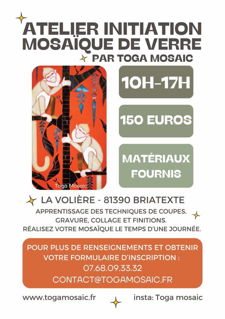 Découvrez l’univers fascinant de la mosaïque/ marqueterie de verre lors d’une journée d’initiation au sein de mon atelier situé à Briatexte, dans le cadre atypique et inspirant du tiers-lieu La Volière.